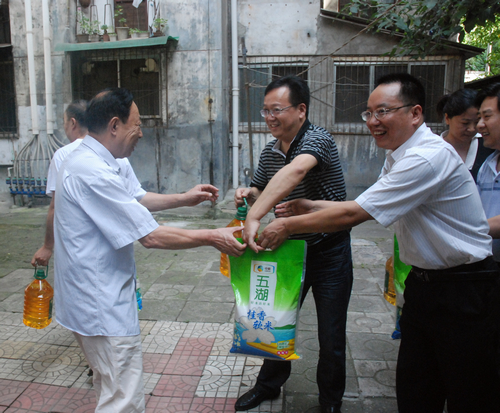 绵阳市委宣传部常务副部长胡科(左2)、集团公司党委副书记蒋一新(左3)为老干部送上慰问品
