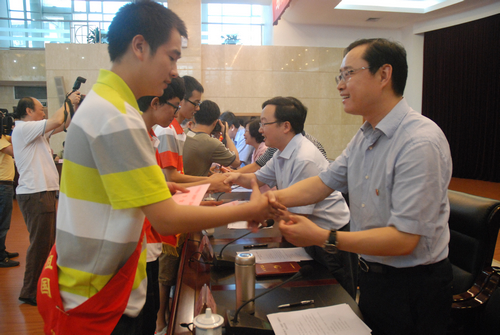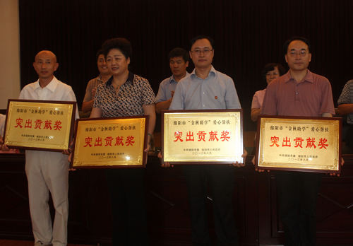 ??? 本网讯? 8月22日,,,,,,,,绵阳市2013年“金秋助学”运动助学金发放仪式在市政府聚会室举行。。。。。绵阳市委书记罗强,,,,,,,,市长林书成,,,,,,,,市人大主任蒋仁富,,,,,,,,市政协主席张世虎,,,,,,,,市委常委、市总工会主席罗晓东,,,,,,,,副市长经大忠等向导出席仪式,,,,,,,,省总工会副主席纪小玲等相关向导受邀出席仪式。。。。。集团公司常务副董事长、总司理、党委书记李亿中作为爱心企业代表出席仪式并在主席台就座。。。。。??? 仪式现场,,,,,,,,李亿中总司理代表集团公司接受市委、市政府授予的金秋助学爱心帮扶“突出孝顺奖”,,,,,,,,作为爱心企业的唯一代表降P蘑向受助学生发放助学金。。。。。