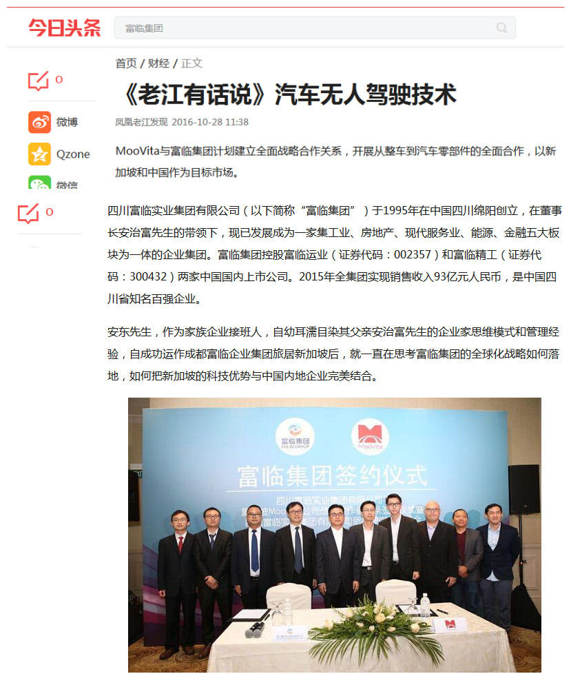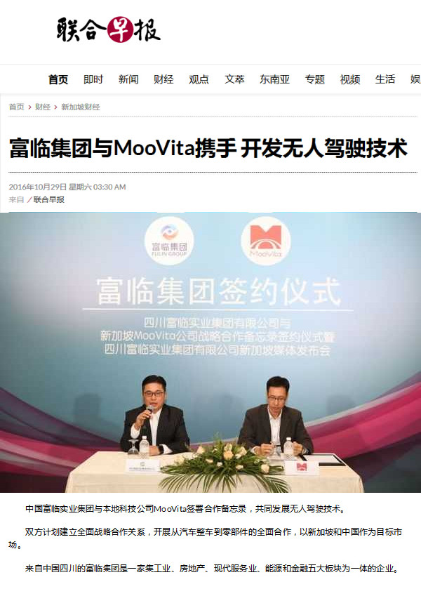 ??????? 本网讯? 10月28日,,,,,,,韦德网站官方入口集团在新加坡与外地科技公司MooVita签署合作备忘录,配合生长无人驾驶手艺,,,,,,,双方妄想建设周全战略合作关系,,,,,,,开展从汽车整车到零部件的周全合作,,,,,,,以新加坡和中国作为目的市场。。。。 。。。