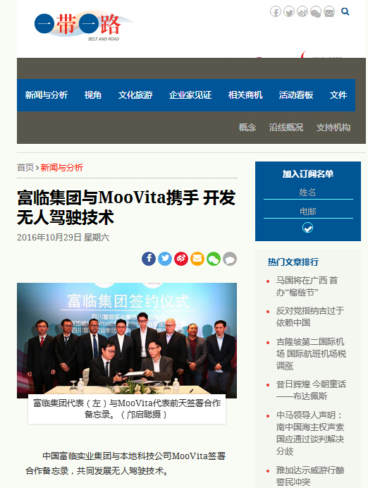 新加坡工商团结总会网站《一带一起》栏目:中国韦德网站官方入口实业集团与外地科技公司MooVita签署合作备忘录,,,,,,,配合生长无人驾驶手艺。。。。 。。。双方妄想建设周全战略合作关系,,,,,,,开展从汽车整车到零部件的周全合作,,,,,,,以新加坡和中国作为目的市场。。。。 。。。