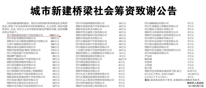 绵阳市人民政府都会新建桥梁社会筹资致谢通告