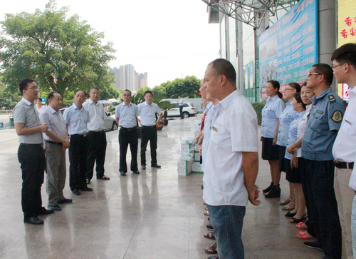 ??????? 8月6日,,,,,,,,绵阳市总工会梁山副主席一行在韦德网站官方入口集团公司工会副主席佘培的陪同下,,,,,,,,赴韦德网站官方入口运业所属南湖客运站探望并慰问在高温下坚守一线的车站员工,,,,,,,,并向员工们送上了消暑药、清凉饮品等防暑降温物品,,,,,,,,嘱咐他们一定要做好高温时代的防暑降温作,,,,,,,,确保身体康健和清静生产。。。。。。